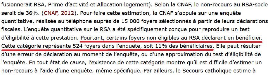 C’est d’ailleurs exactement ce que nous disent les enquêtes du Secours catholique (p.47). Le Secours Catholique est une association qui s’adresse précisément aux publics les plus en difficulté, les SDF, les personnes désocialisées etc. En enquêtant, ils ont découvert que jusqu’à 40 % de leurs bénéficiaires pourraient toucher le RSA mais n’y avait pas recours.