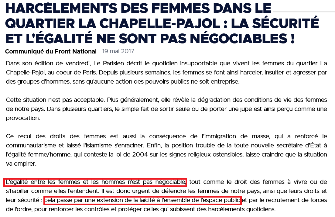 Mais peu de gens pointent ce dévoiement de la laïcité par Marine le Pen. Dans ses discours, elle va de plus en plus souvent présenter ses critiques des musulmans et de leurs pratiques comme une simple défense de la “laïcité” et des “valeurs républicaines”.