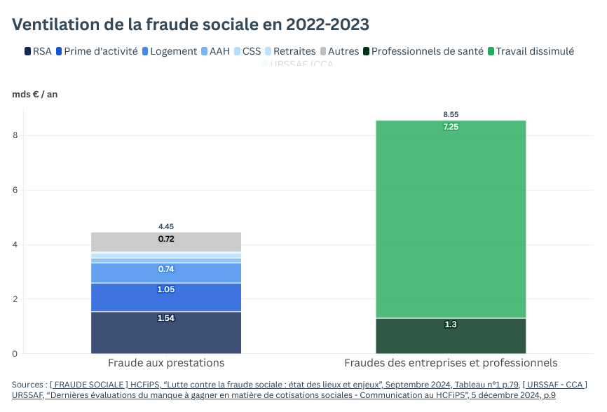 La fraude aux prestations sociales, celle qui est souvent présentée comme très coûteuse par la droite et l’extrême-droite, représente en réalité seulement ⅓ de la fraude sociale, autour de 4,5 milliards d’euros/an.