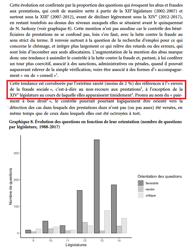 [ SOURCE : Vincent Dubois et Marion Lieutaud, “La « fraude sociale » en questions La naturalisation d’une thématique politique au prisme des questions à l’assemblée nationale (1986-2017)”, 2020, p.21 ]