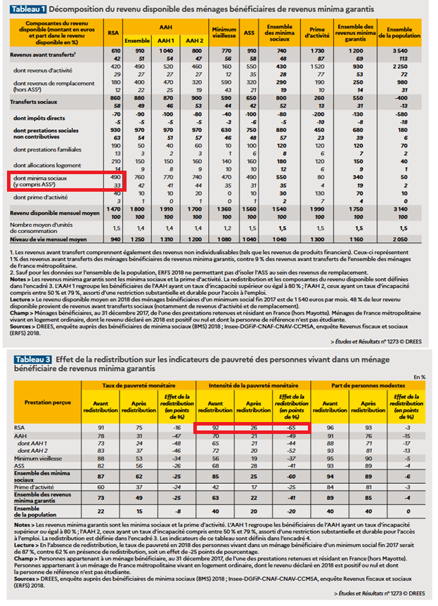 [ SOURCE : DREES, “Les trois quarts des bénéficiaires du RSA sont pauvres monétairement”, Juillet 2023, Tableau 1 et 3 pp.4 et 6 ]