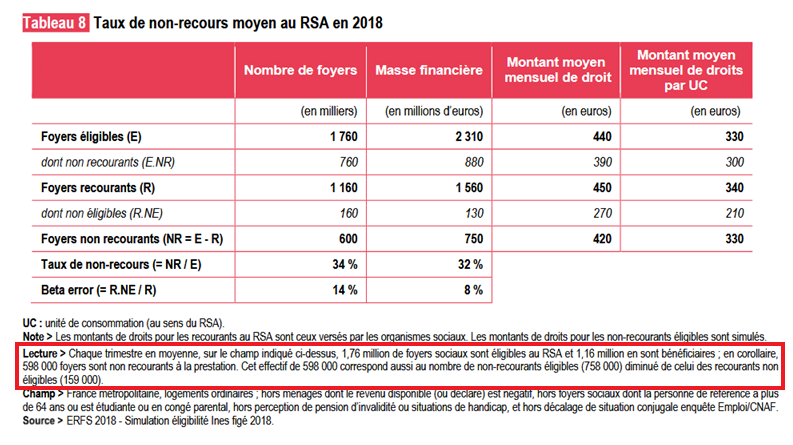Il s’agit pourtant d’un sujet majeur. Selon la dernière enquête sur le sujet, un tiers des foyers éligibles au RSA n’y a pas recours. Ca représente 3 milliards d’euros [750 millions / trimestre * 4] de RSA non versés en 2018.