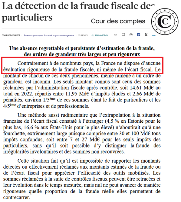 [ SOURCE : Le Monde, La Cour des comptes presse l’exécutif de chiffrer la fraude fiscale, 15 novembre 2023 & Cour des Comptes, “La détection de la fraude fiscale des particuliers “, Décembre 2023, p.11 ]