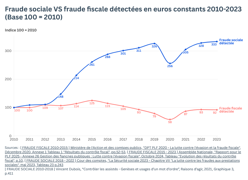 La comparaison avec la fraude sociale est terrifiante. Alors qu’en euros constants, on détecte 3.3 fois + de fraude sociale aujourd’hui qu’en 2010, la détection de la fraude fiscale, elle, végète.