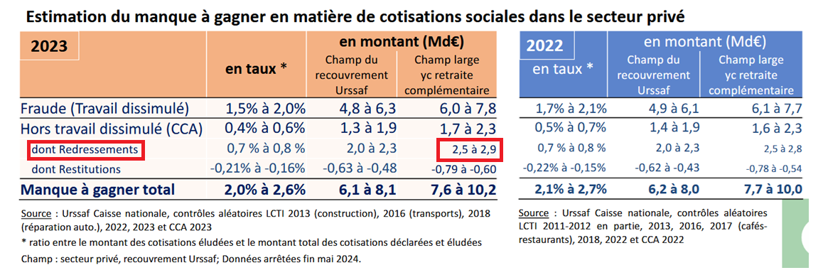 [ SOURCE : URSSAF, “Dernières évaluations du manque à gagner en matière de cotisations sociales – Communication au HCFiPS”, 5 décembre 2024, p.9 ]