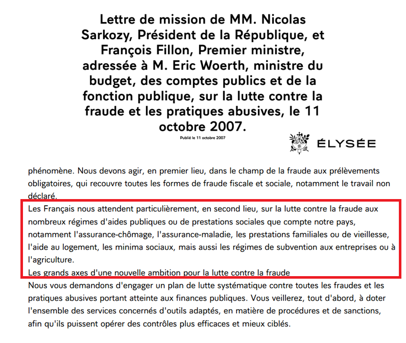 [ SOURCE : Elysée – Présidence de la République, “Lettre de mission à M. Eric Woerth sur la lutte contre la fraude et les pratiques abusives”, 11 octobre 2007 ]