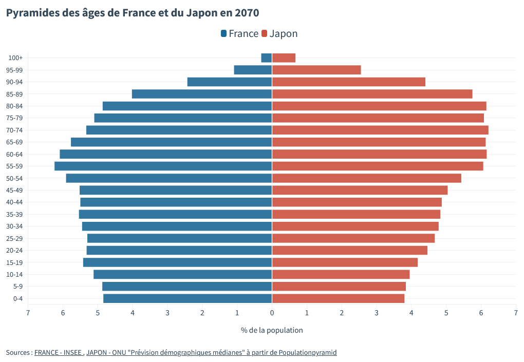 En 2070, ça sera 37.9% de japonais qui auront + de 65 ans, contre 28.9% en France – d’après les prévisions de l’INSEE sur la base de nos dynamiques actuelles.