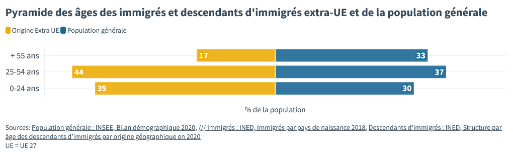 D’abord, il faut savoir que les immigrés et leurs descendants d’origine extra-européenne sont plus jeunes que la population générale.