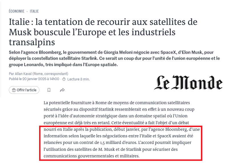 Depuis, on a appris que Meloni voulait confier à Starlink un contrat de 1,5 milliards de dollars pour avoir des communications satellitaires sécurisées.